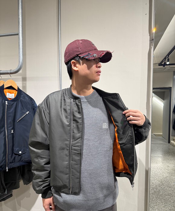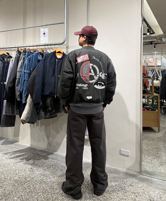 音牆十週年推出的飛行外套後方製圖和手袖異材質拼接細節滿滿以外,也是凸顯身材的寬短版型,內裏採用橘色經典的軍裝特色,搭配Melsign 弧形褲讓身材比例更佳,配色也是低調帥。