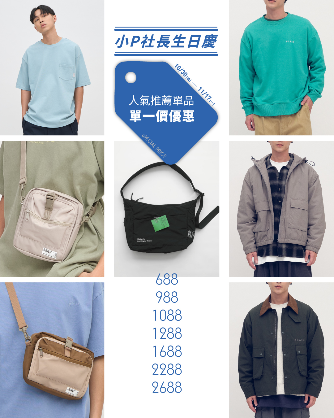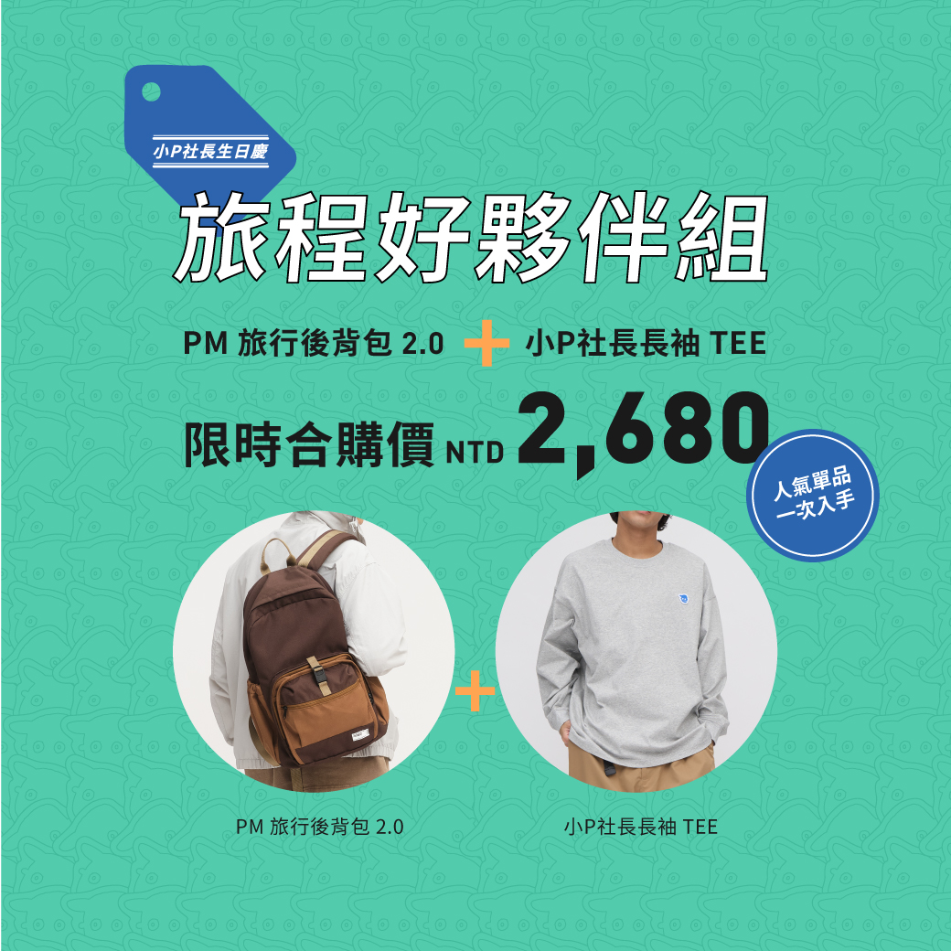 1. PLN3059-第二代-PM旅行後背包 單一價:1,880,PLN0126-小P社長logo多色長袖鬆身TEE 合購價:2,680 (兩樣商品各一件)